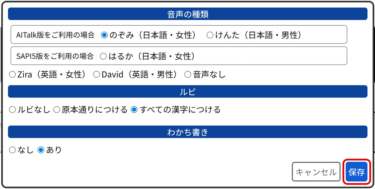 - 固定:原本イメージと同じレイアウトで、画像にある文章をハイライトして読み上げます。ルビは原本にあるルビのみで付けることはできません。