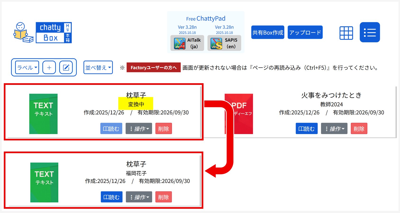 変換が完了すると、「変換中」⇒(ログインしているユーザーの氏名)と表示が変わり、『読む』ボタンが有効になります。